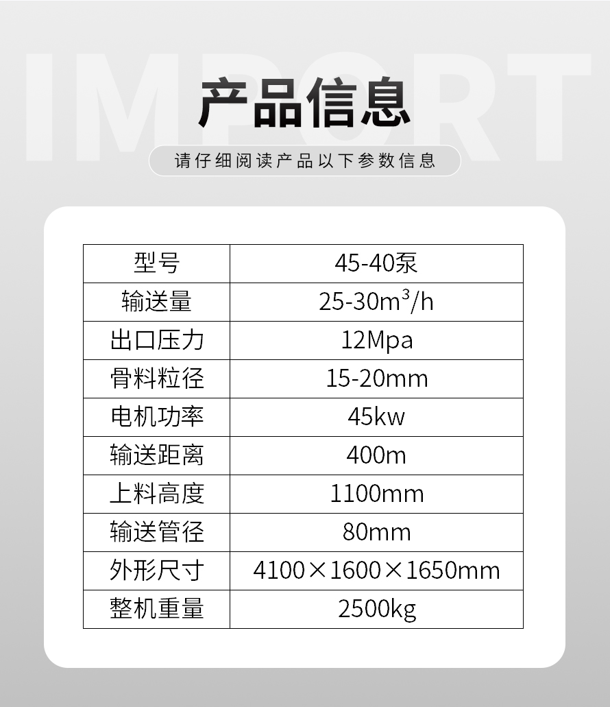 產(chǎn)品介紹: 1,大流量 采用加粗料缸,讓機(jī)械每一次循環(huán)出料多20% 2,效率高 移動(dòng)便捷全部采用快接式管道卡,提高工作效率 3,便捷 本機(jī)可遠(yuǎn)程遙控,操作不受地點(diǎn)限制,更加人性化 產(chǎn)品用途: 坡道灌漿,水平地面,隧道澆筑,模