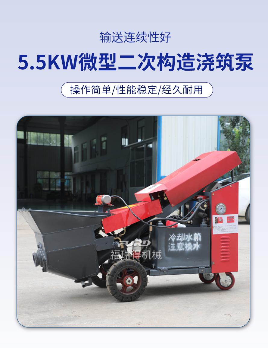福瑞得二次結(jié)構(gòu)澆筑泵適用于商品房、農(nóng)村建房,打二次構(gòu)造柱,圈梁等,是您澆筑的好設(shè)備。電機功率小,體積小,重量輕,料斗可升降,真正能提高您的施工效率,是人工澆筑的幾十倍。