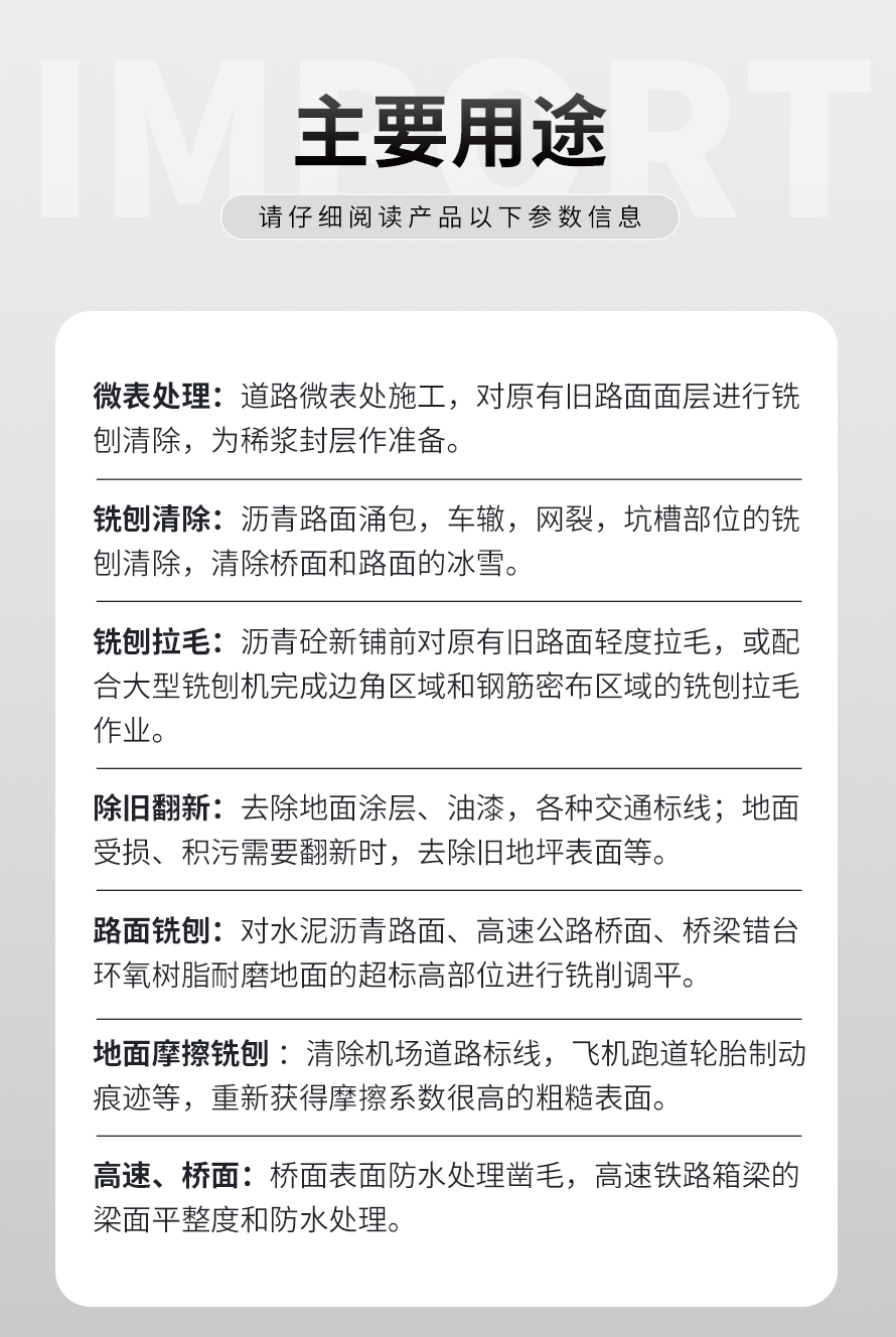 液壓銑刨機(jī)結(jié)構(gòu)緊湊,布局合理,具有控制精度高、性能穩(wěn)定、操作簡(jiǎn)單、維護(hù)保養(yǎng)方便等優(yōu)勢(shì)。其適合各種強(qiáng)度較高的混凝土瀝青等高出部分的去除工作,是其它類型的銑刨機(jī)無法替代的產(chǎn)品。
